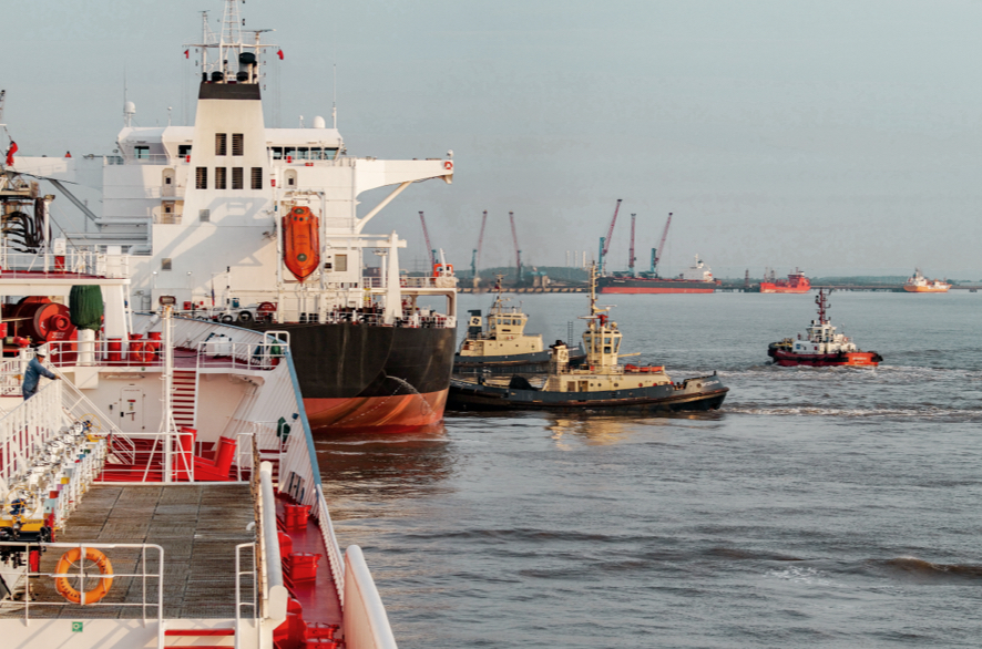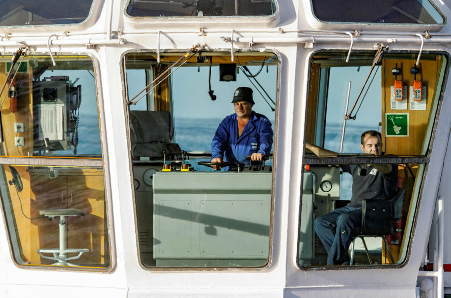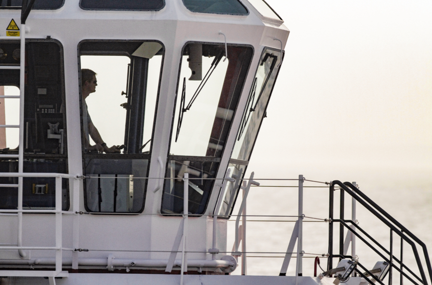 The crew of tugboat ‘Bob’ discussing their plans and watching closely, whilst standing by for the Pilot’s orders.